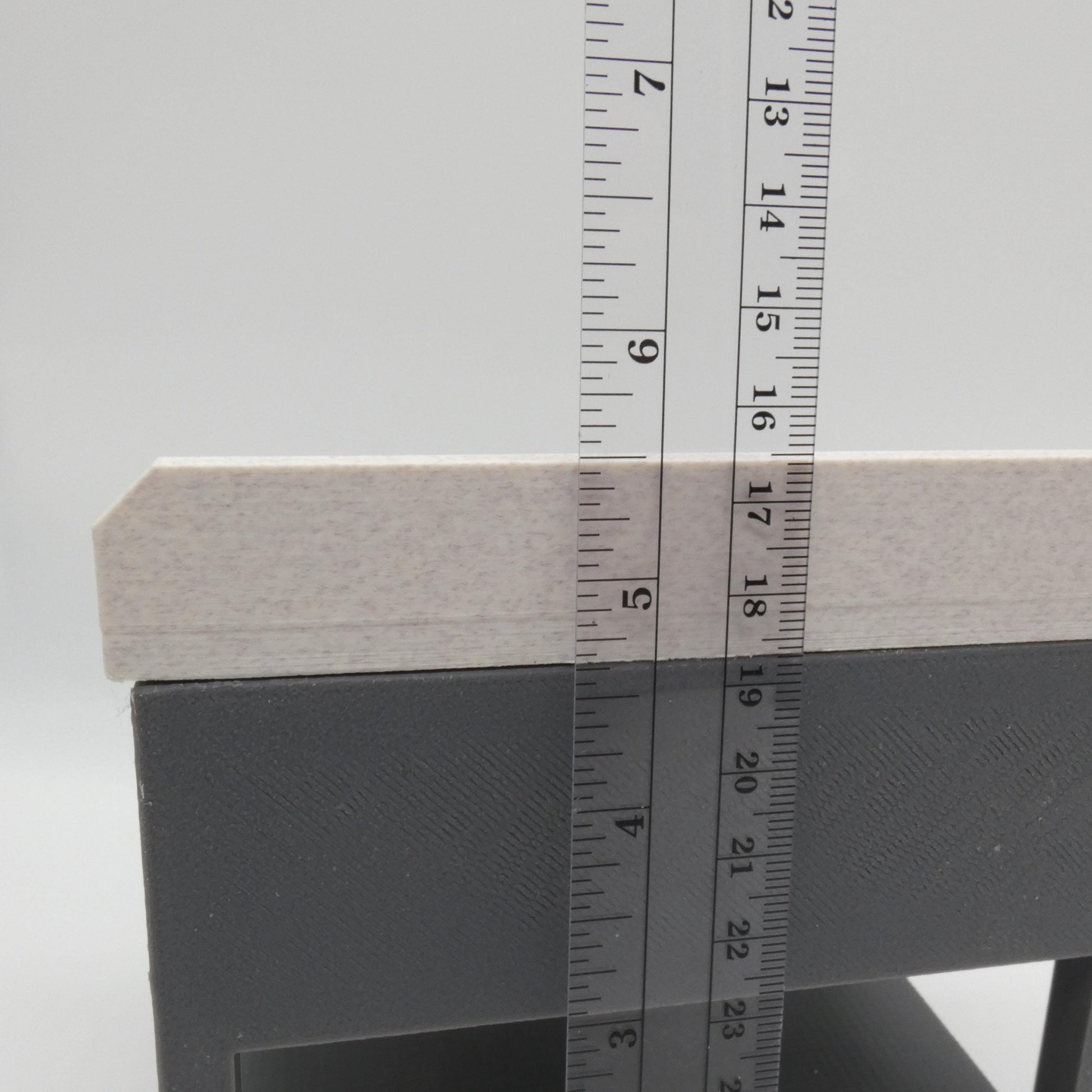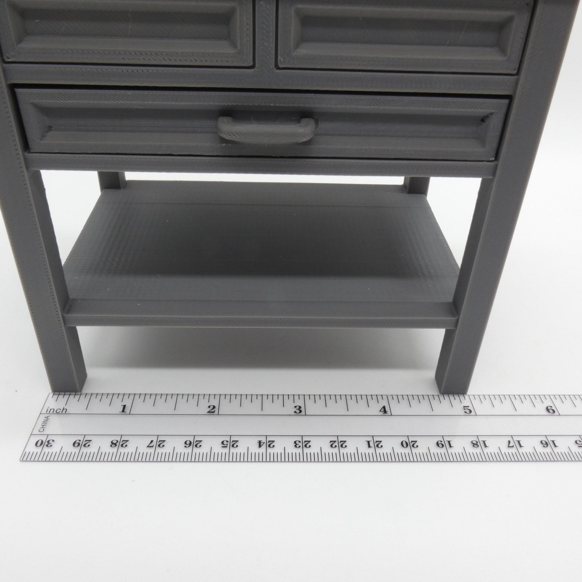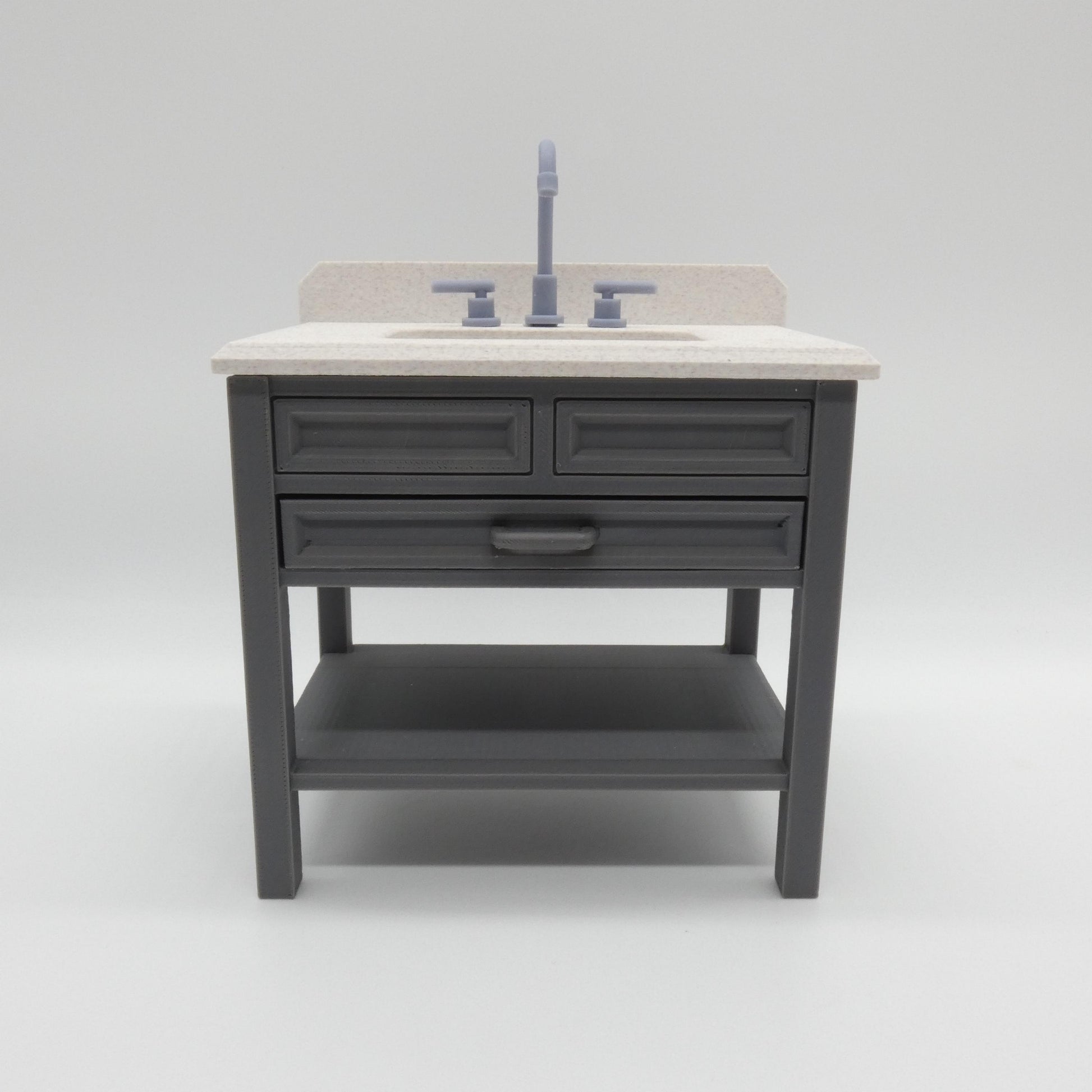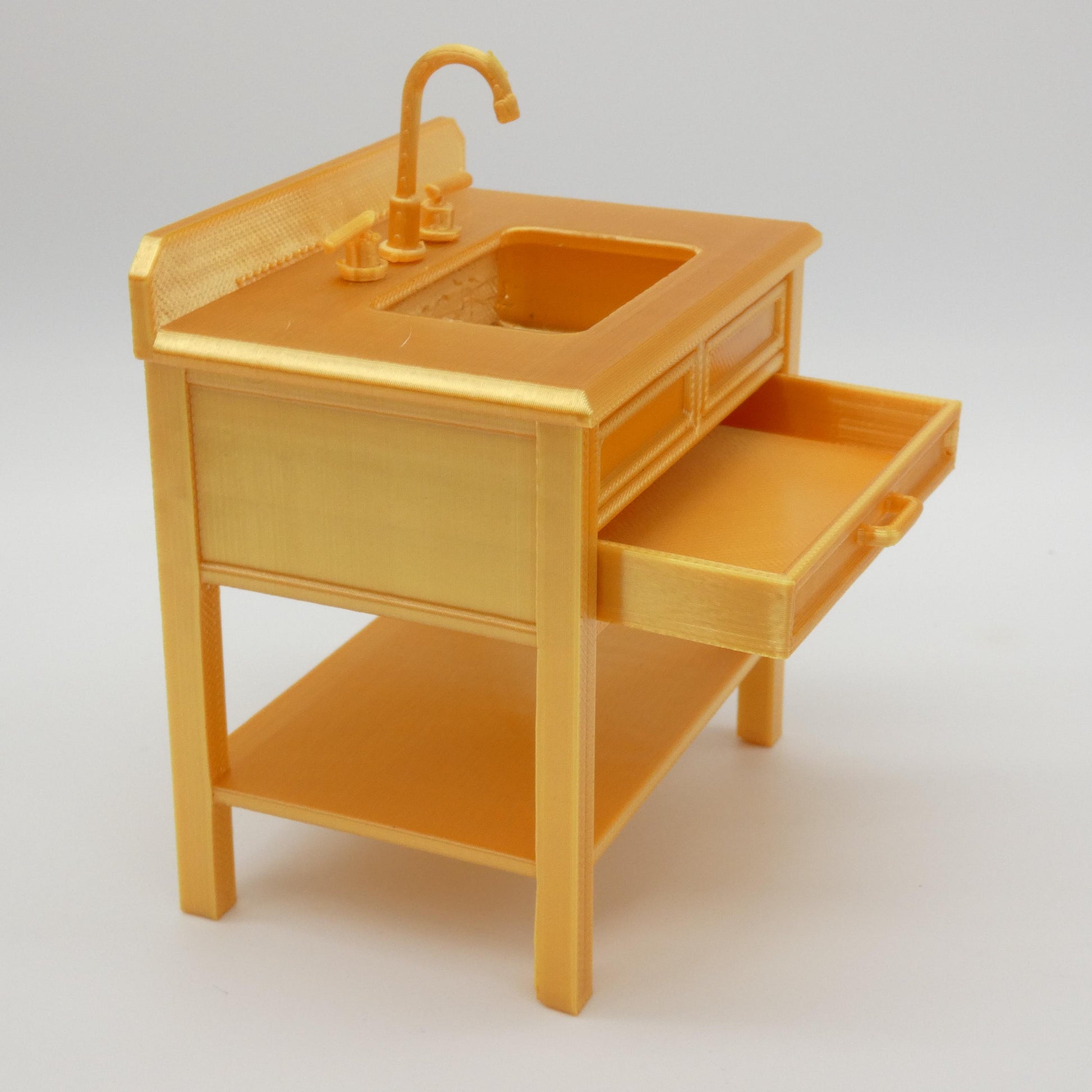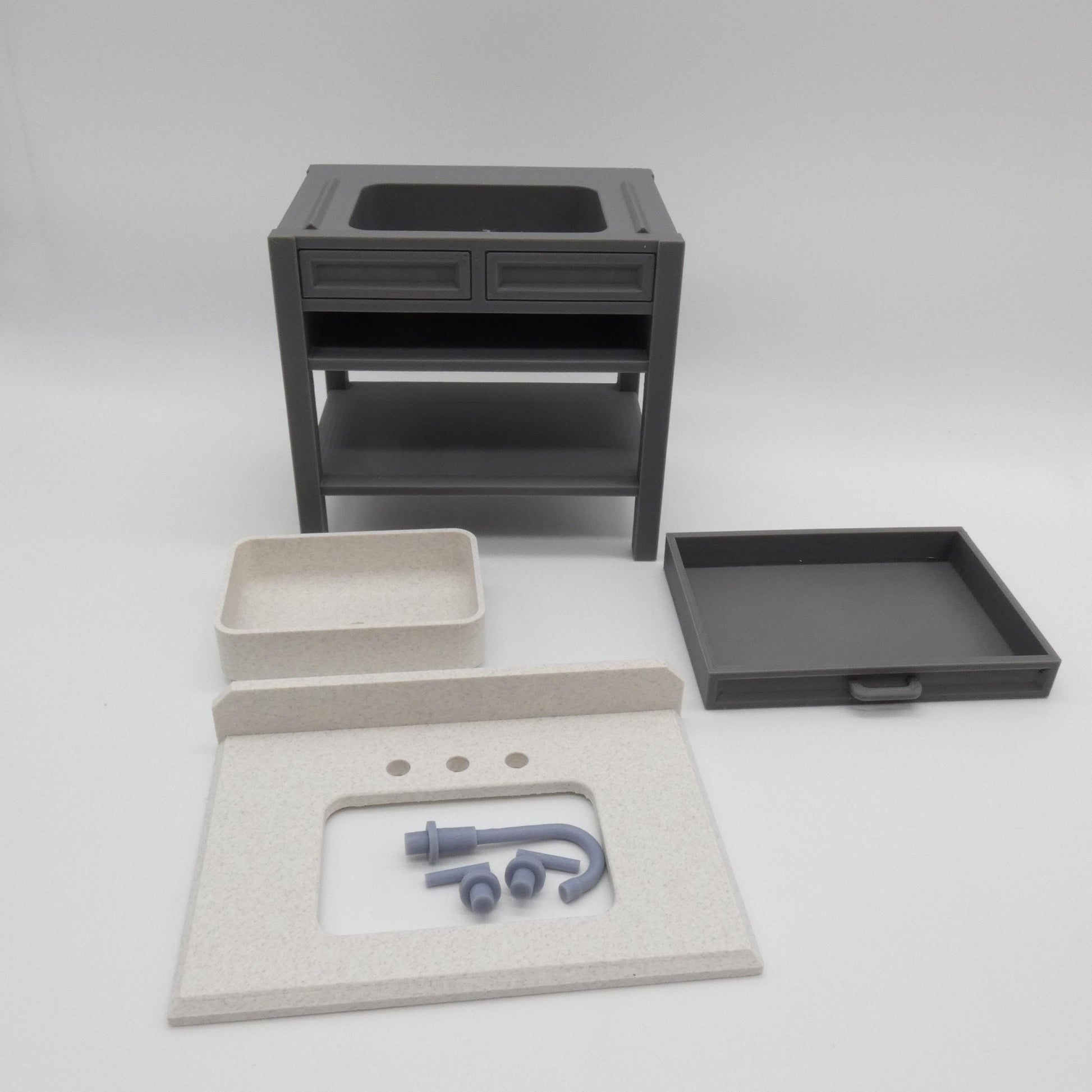 This is a 3D printed piece of furniture, printed by me. It is made with PLA plastic for the cabinet, drawer, countertop, and sink. The faucet and knobs are resin printed. The cabinet and drawer are gray, and the countertop and sink are a marbled/speckled white. Due to the nature of 3D printing there will be minor flaws and variances in appearance from piece to piece, just as in real furniture. Comes with 1 faucet, 2 handles, and 1 drawer. The handles come separated and are NOT ATTACHED, but can be glued in place. Doll, doll accessories, and doll stands are not included. Designed by UniqueTinyThings. Please review the pictures carefully.