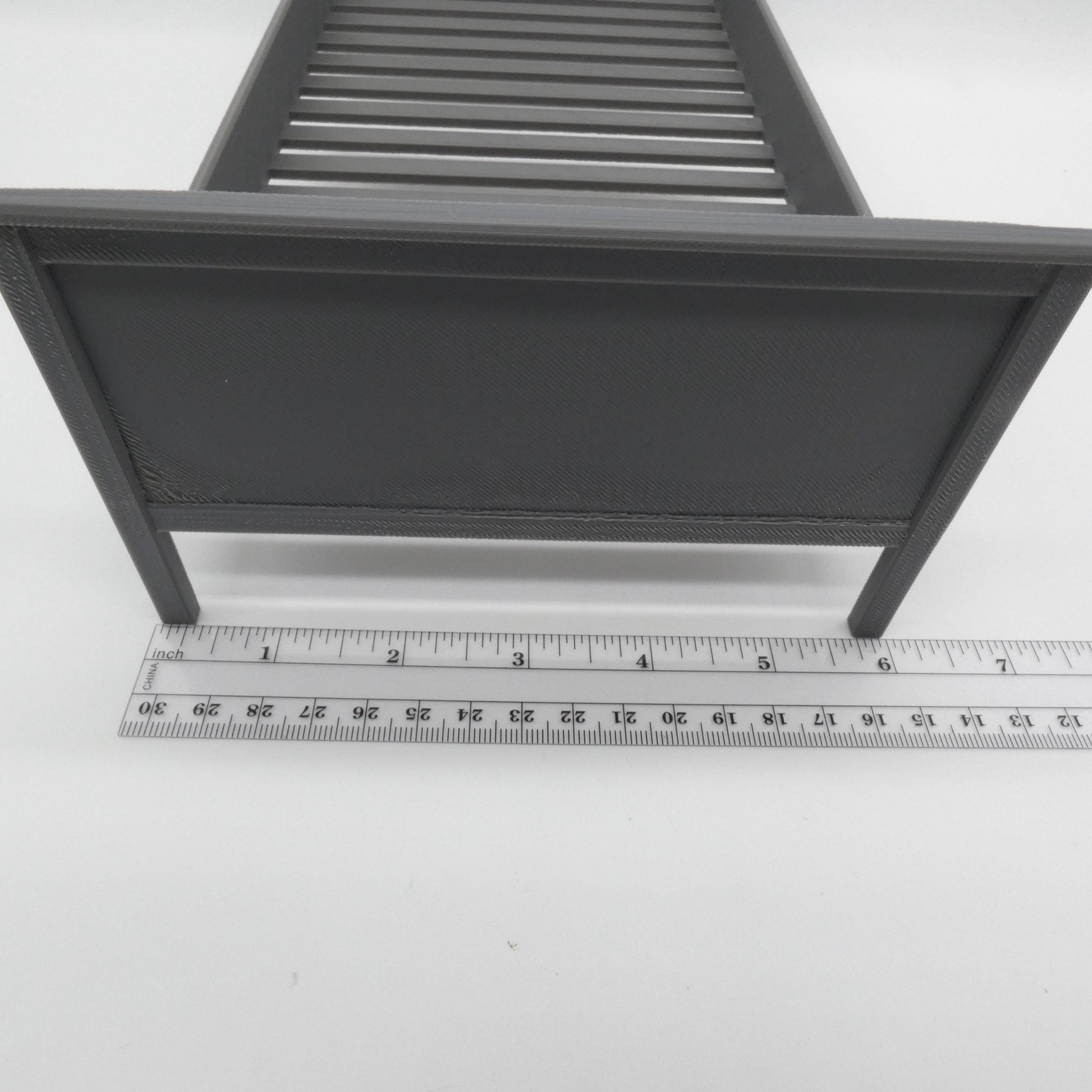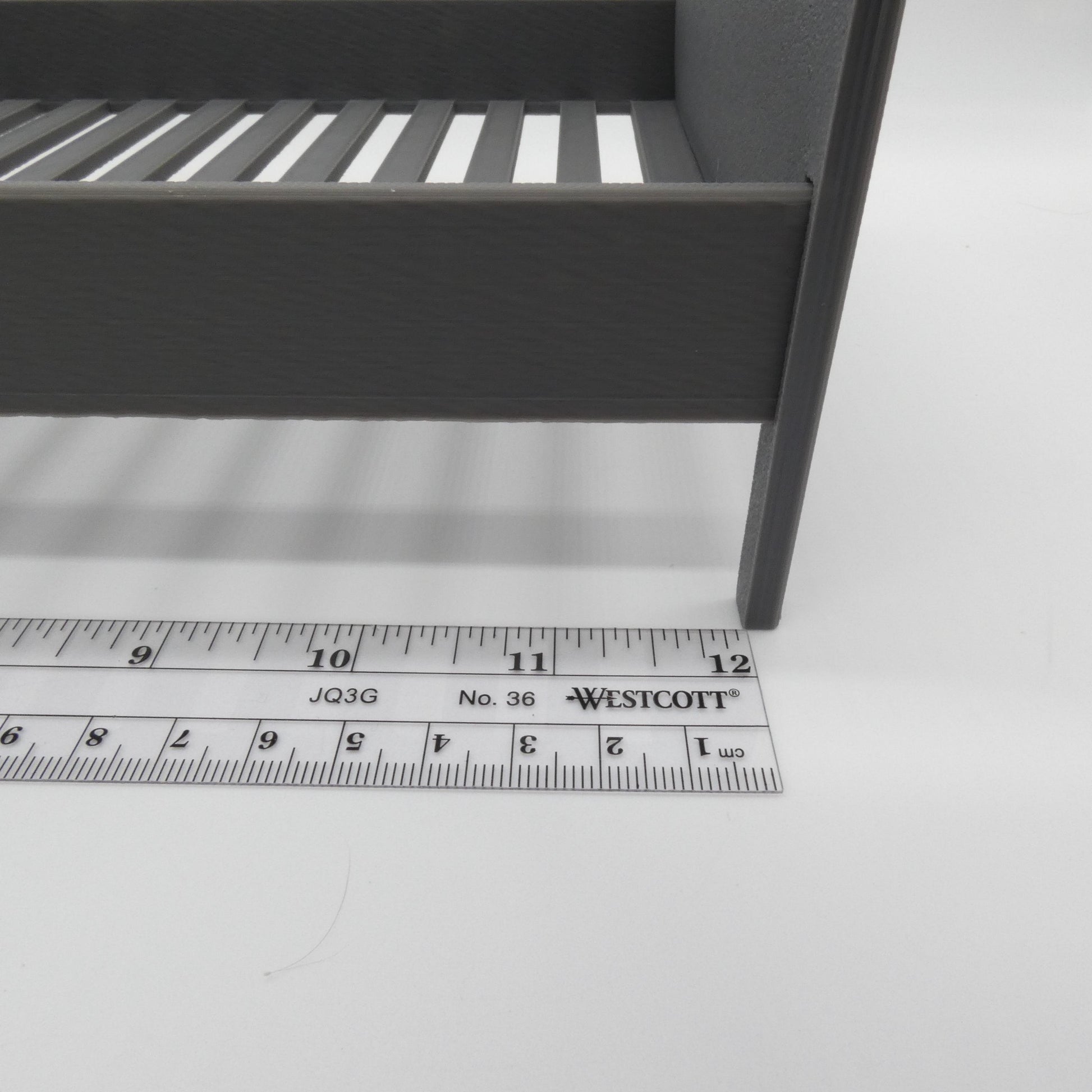 This is a 3D printed piece of furniture, printed by me. This is for the bed frame only, no mattress is included! It is a single/twin size equivalent. The entire unit is gray in color. It is made with PLA plastic, and has not been painted. It is paintable, a primer coat would be highly recommended. Due to the nature of 3D printing there will be minor flaws and variances in appearance from piece to piece, just as in real furniture. It comes exactly as shown in the UNASSEMBLED last picture. No glue is supplied. Doll and stand are not included. Please review the pictures carefully. Designed by UniqueTinyThings.