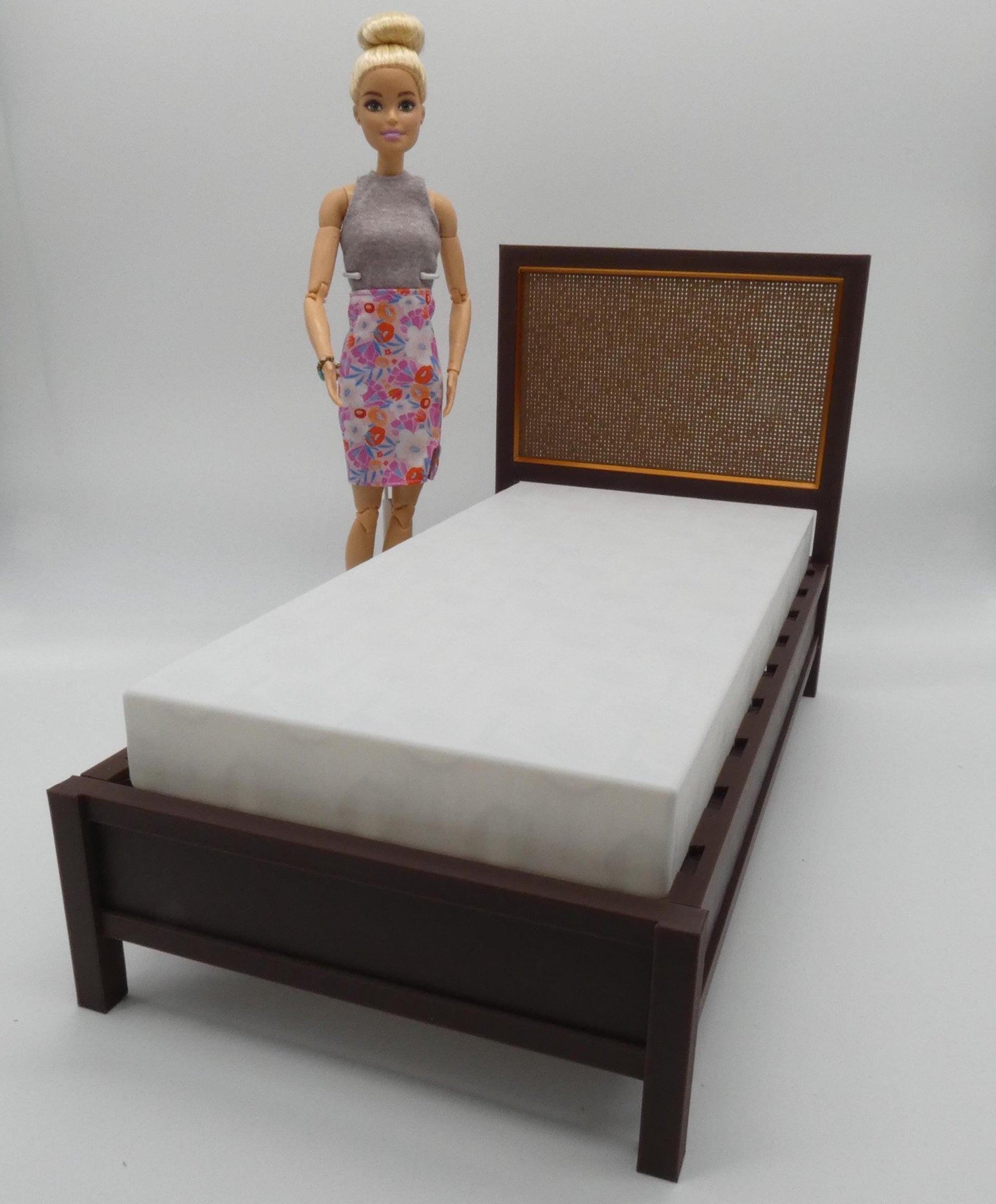 This is a 3D printed piece of furniture, designed and printed by me. This is for the bed frame with slats, headboard, and the mattress is included! It is a single/twin size equivalent. You choose the frame color as the primary choice. The headboard screen is the secondary color choice. It is made with PLA plastic, and has not been painted. It is paintable, a primer coat would be highly recommended. Due to the nature of 3D printing there will be minor flaws and variances in appearance from piece to piece, just as in real furniture. It comes exactly as shown in the UNASSEMBLED last picture. No glue is needed to assemble it. Doll and stand are not included. Does not come with any sheets or linens. Please review the pictures carefully.