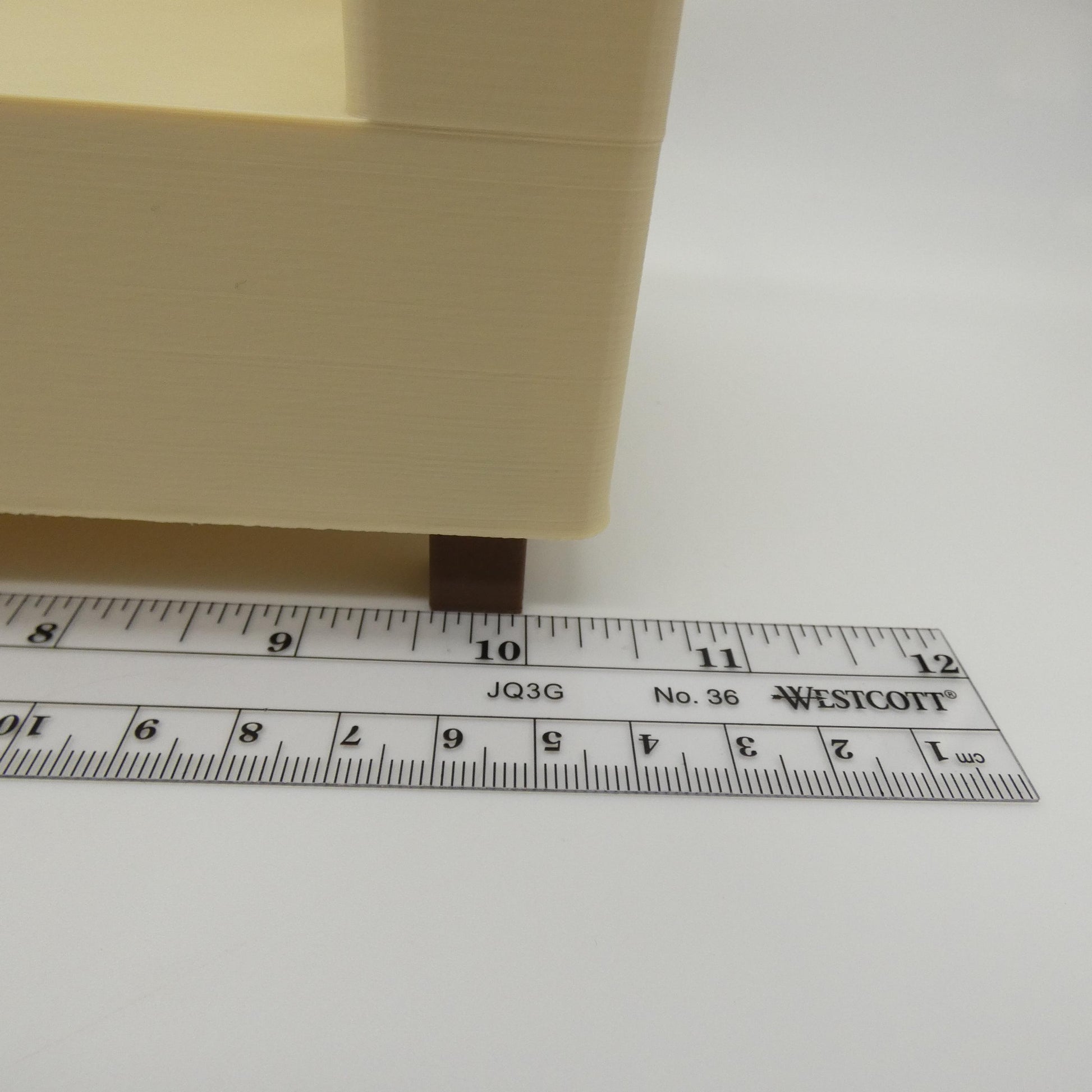 This is a 3D printed piece of furniture, printed by me. This is for a couch with wood tone legs, seat cushions, back cushions, and two throw pillows (all made of plastic). It is made with PLA plastic, and has not been painted. It is paintable, a primer coat is recommended. Due to the nature of 3D printing there will be minor flaws and variances in appearance from piece to piece, just as in real furniture. Dolls and props are not included. It will come with the legs attached. Please review the pictures carefully.