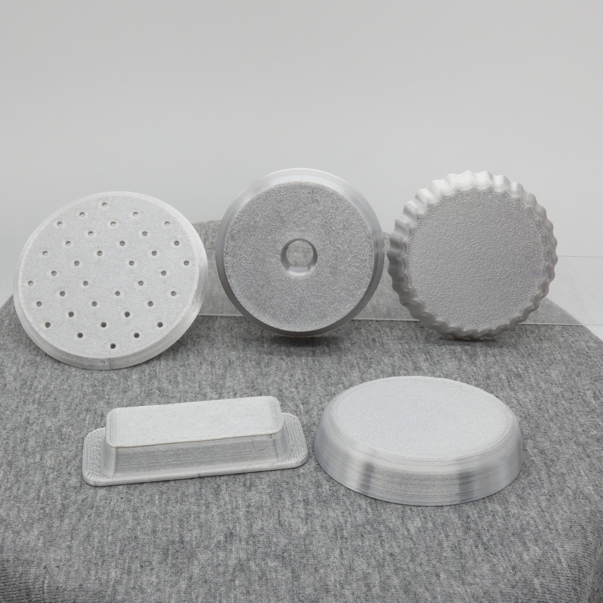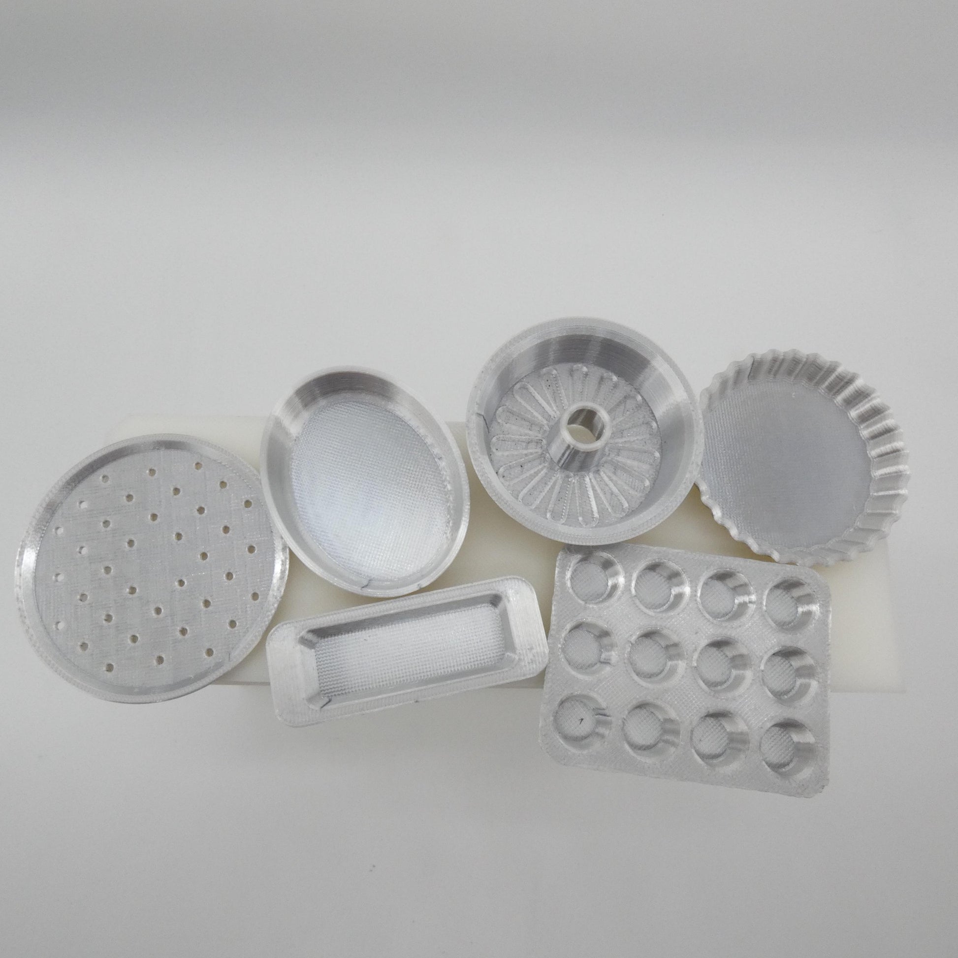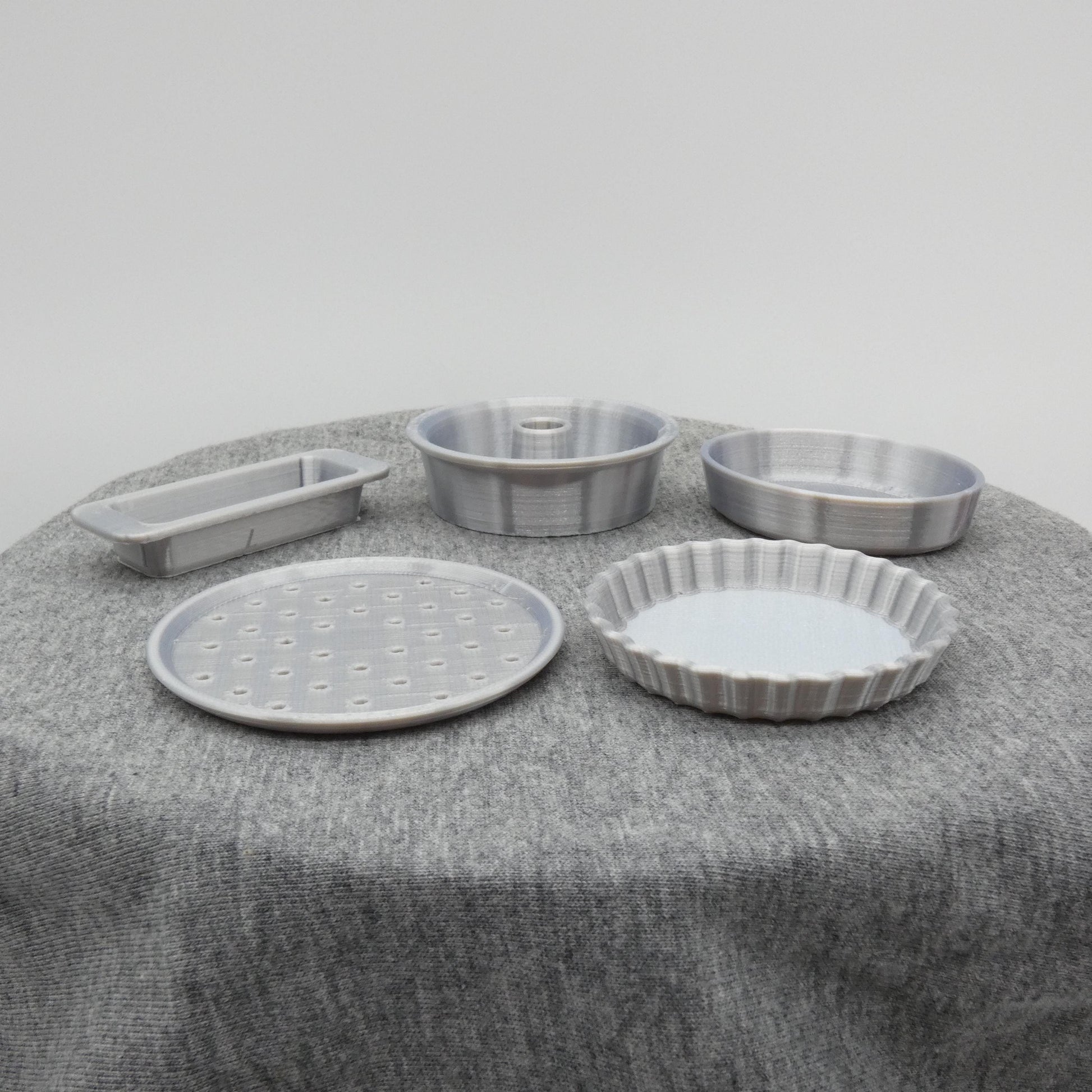 These are 3D printed plastic baking dishes, printed by me. Set includes: muffin pan, casserole dish, bread pan, pie pan, pizza pan, and Bundt pan. It is made with PLA plastic, and has not been painted. It is paintable, a primer coat would be required. Due to the nature of 3D printing there will be minor flaws and variances in appearance from piece to piece, just as in real furniture and decor. Doll and stands are not included. Designed by UniqueTinyThings.