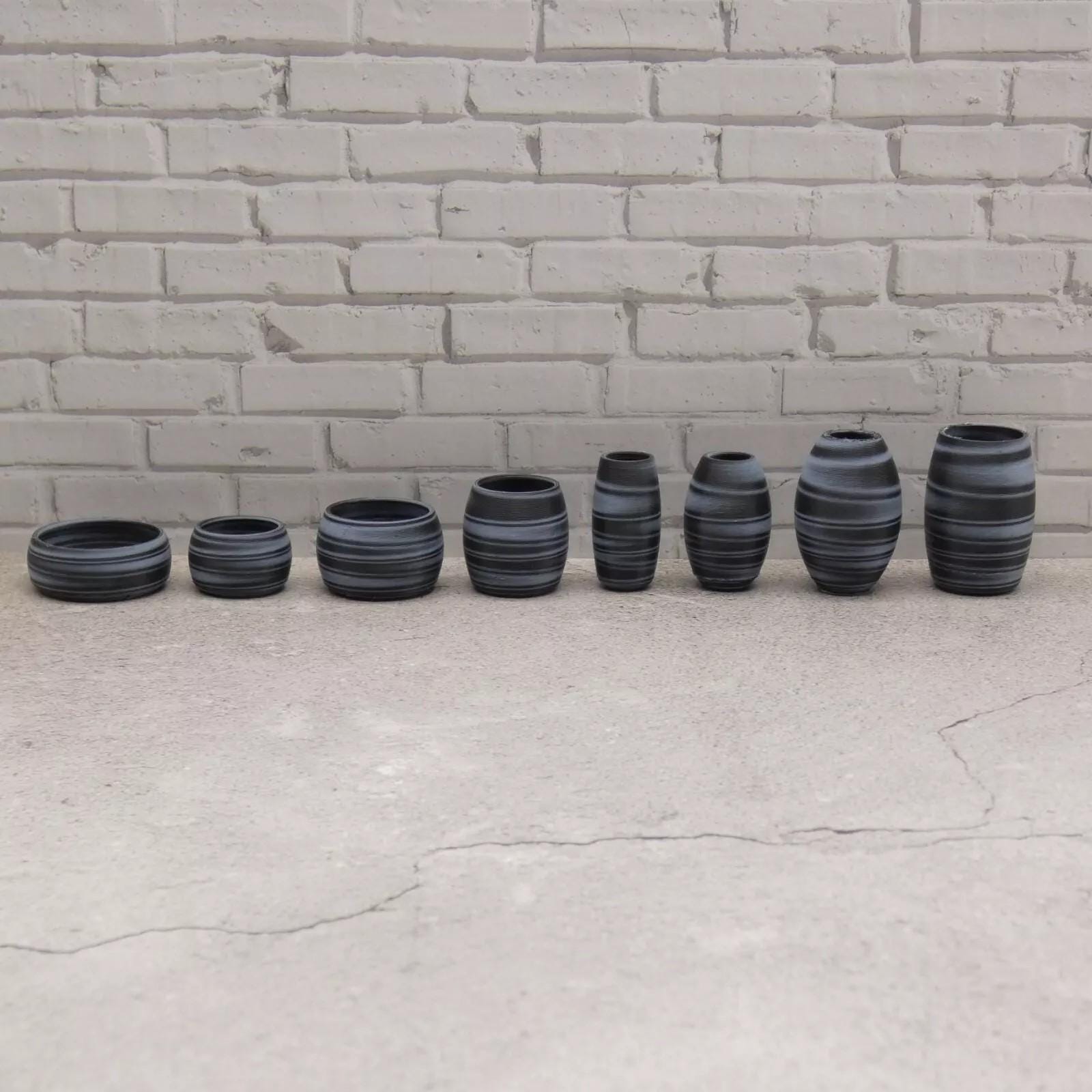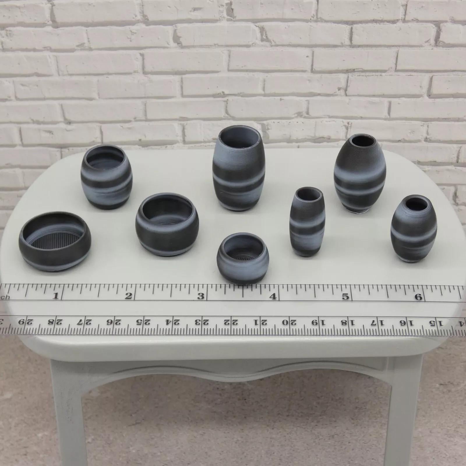 Vases only. These are 3D printed PLA plastic vases, printed by me. Vases have not been painted. Vases are paintable, a primer coat is recommended. Due to the nature of 3D printing there will be minor flaws and variances in appearance from piece to piece, just as in real furniture and decor. Please note, the pattern for each set will vary, see photos toward the end for another pattern example. Doll, table, flowers, plants, and stands are not included. Set of 8 vases only. Designed by UniqueTinyThings.