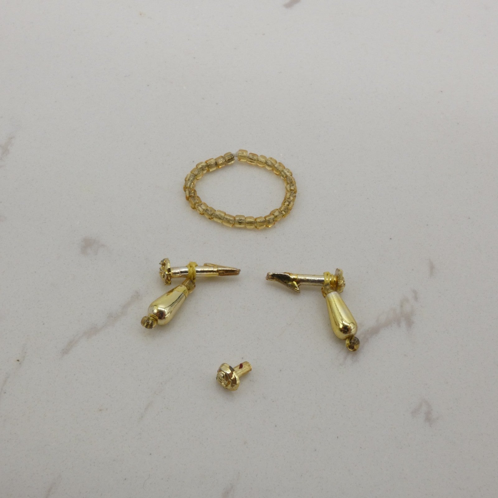 In pre-owned played with condition. Set of (2) Earrings, Choker Necklace, and Ring only. May have marks, scratches, hanging threads, dropped seams, and/or scuffs. Item has not been washed. Doll and stand are not included.